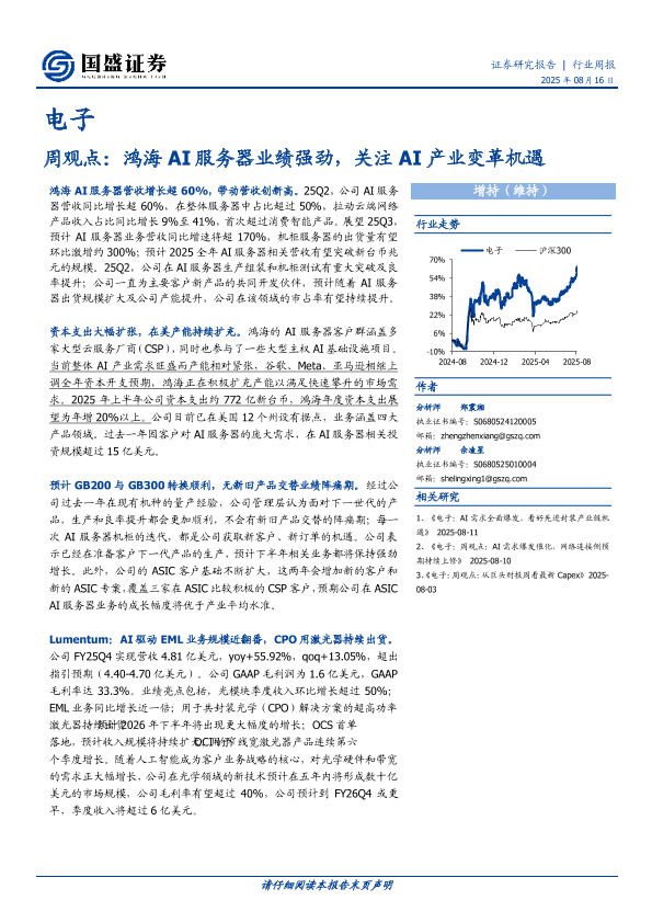资本支出 LUMENTUM 电子行业 鸿海 AI服务器