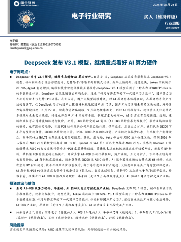 【国金证券】【20250824】Deepseek发布V3.1模型-继续重点看好AI算力硬件-10页