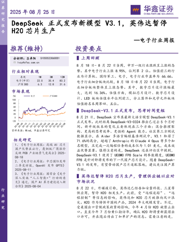 【华鑫证券】【20250825】DeepSeek-V3.1正式发布,英伟达暂停H20芯片生产-电子行业周报-28页