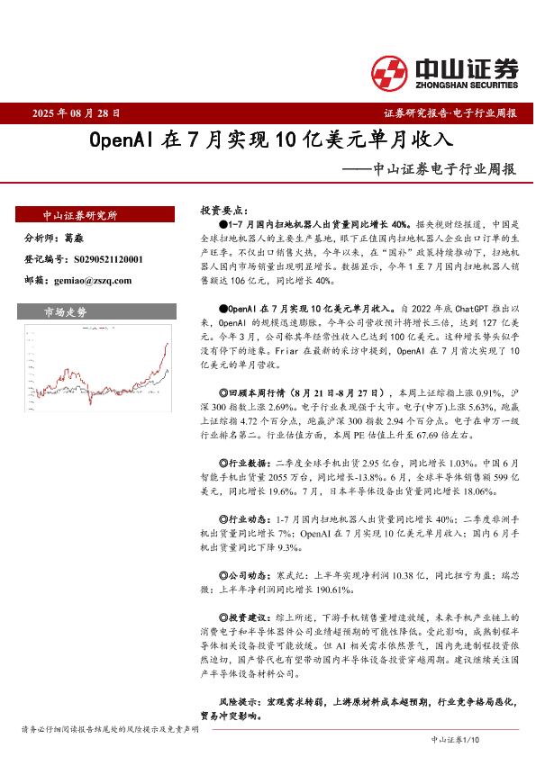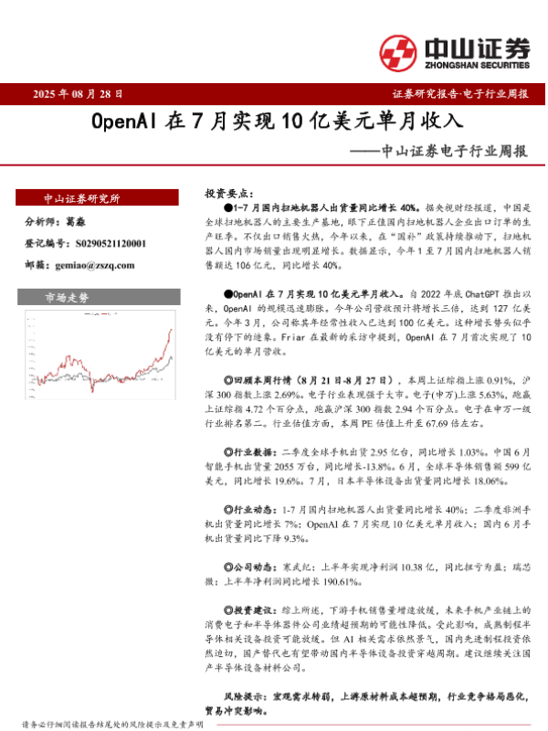 【中山证券】【20250828】OpenAI在7月实现10亿美元单月收入-中山证券电子行业周报-10页