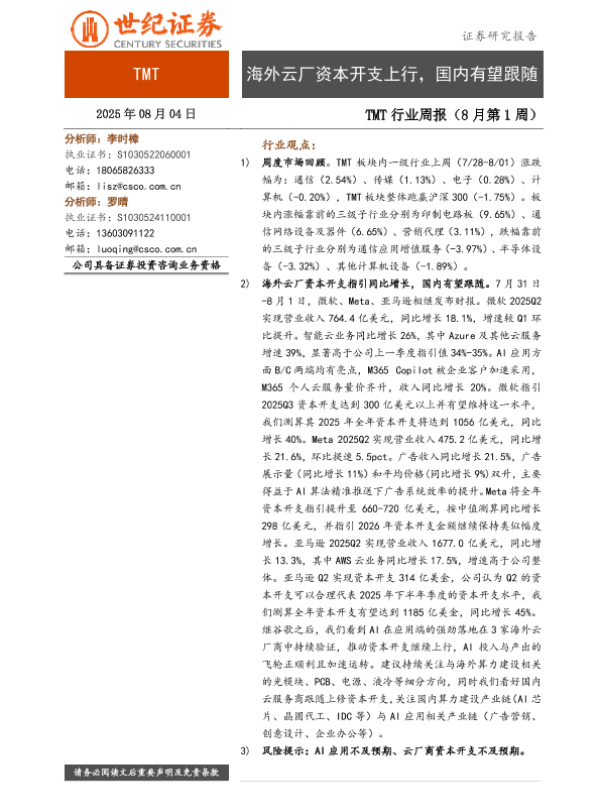 【世纪证券】【20250804】海外云厂资本开支上行,国内有望跟随-14页