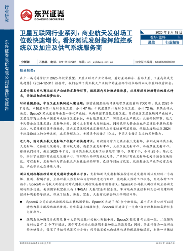 【东兴证券】【20250818】卫星互联网行业系列:商业航天发射场工位数快速增长,看好测试发射指挥监控系统以及加注及供气系统服务商-21页
