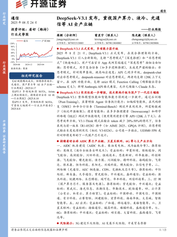 【开源证券】【20250824】DeepSeek-V3.1发布-重视国产算力、液冷、光通信等AI全产业链-13页