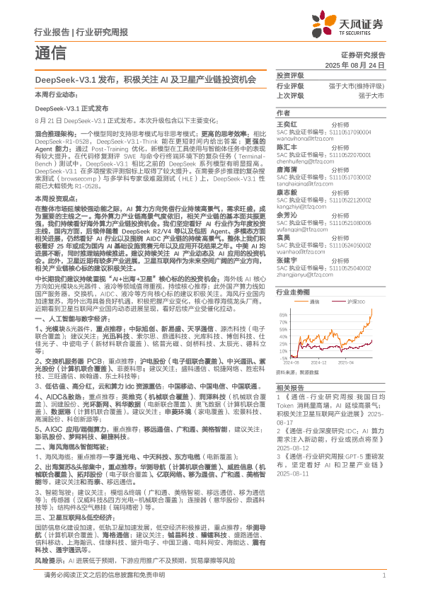 【天风证券TF SECURITIES】【20250824】DeepSeek-V3.1发布,积极关注 AI及卫星产业链投资机会-13页