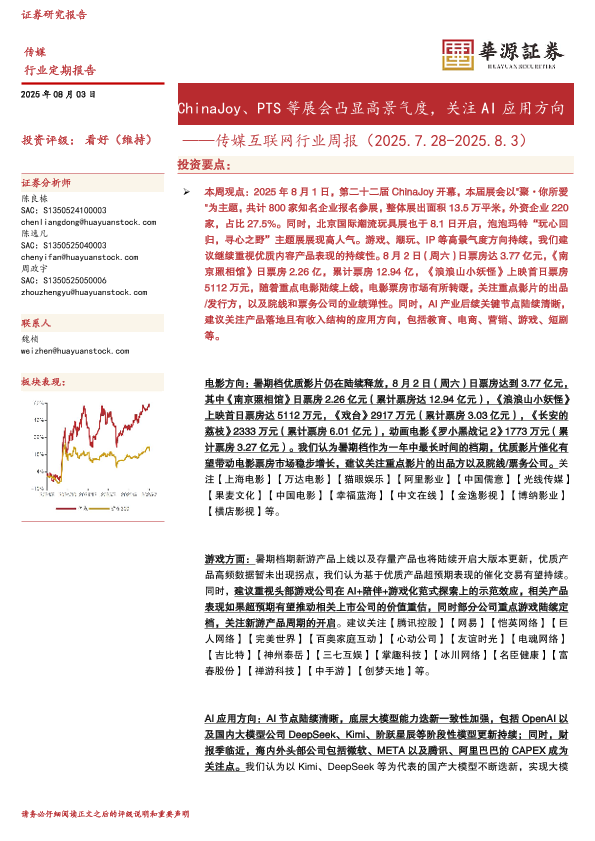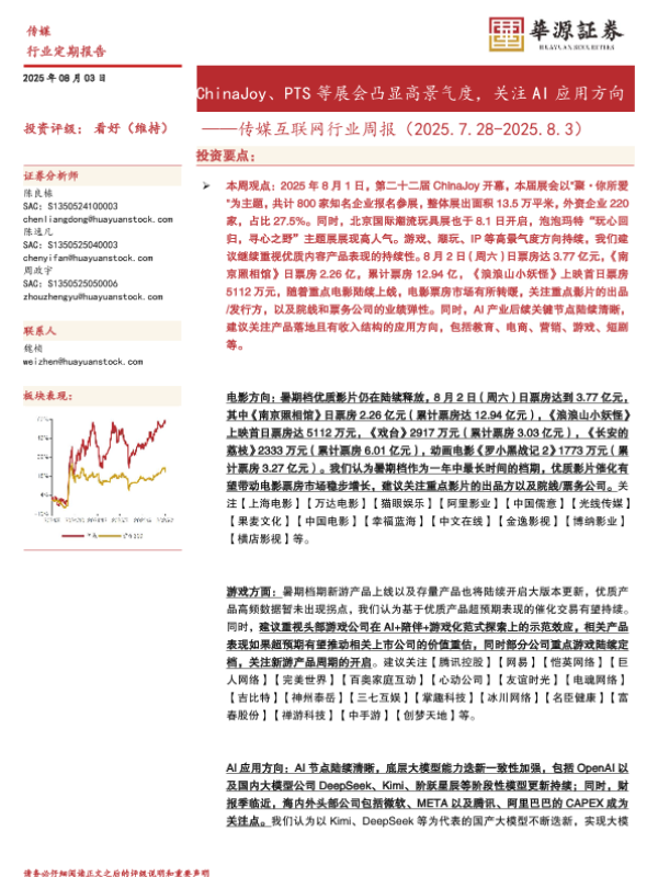 【华源证券】【20250803】传媒互联网行业周报:ChinaJoy、PTS等展会凸显高景气度,关注AI应用方向-17页