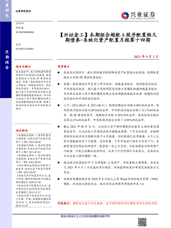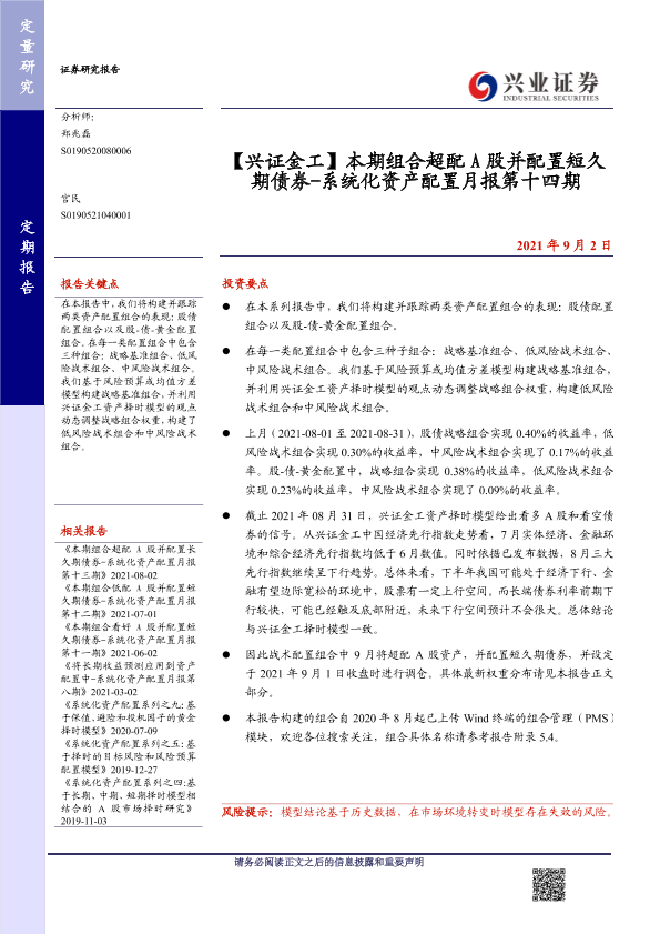 【兴业证券】【20210902】【兴证金工】系统化资产配置月报第十四期:本期组合超配A股并配置短久期债券-16页