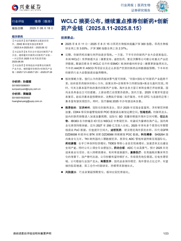 【兴业证券】【20250818】WCLC摘要公布,继续重点推荐创新药+创新药产业链-23页