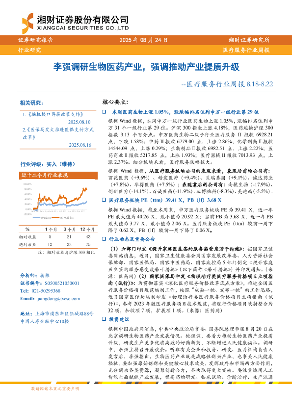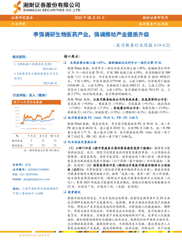 【湘财证券】【20250824】李强调研生物医药产业,强调推动产业提质升级-医疗服务行业周报 8.18-8.22-11页