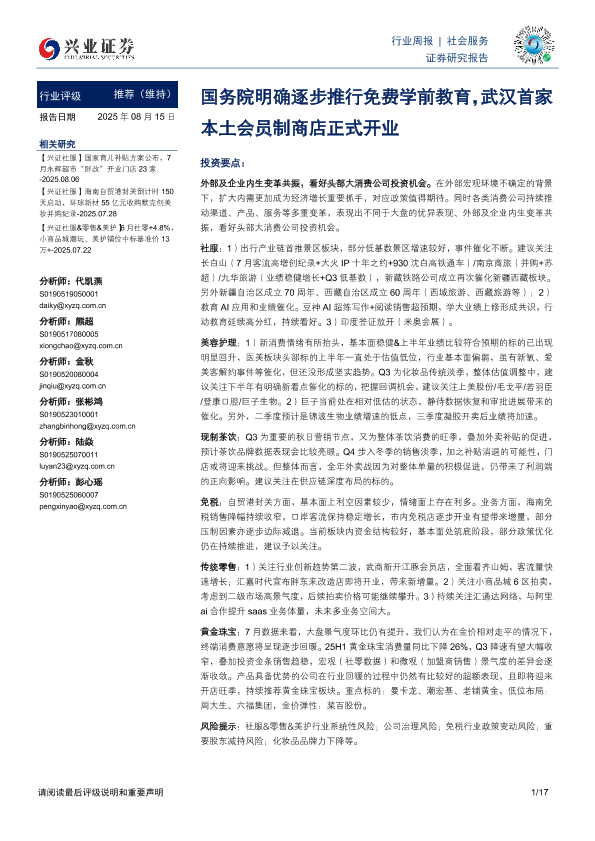 【兴业证券】【20250815】国务院明确逐步推行免费学前教育-武汉首家本土会员制商店正式开业-17页