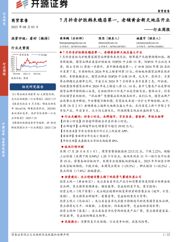 【开源证券】【20250803】老铺黄金-7月抖音护肤韩束稳居第一,老铺黄金新天地店开业-22页