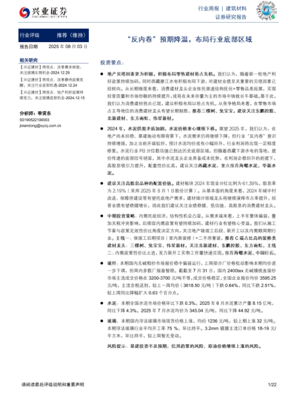 【兴业证券】【20250803】建筑材料行业周报:“反内卷”预期降温,布局行业底部区域-22页