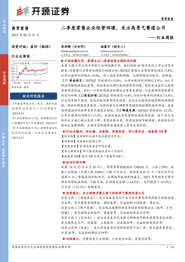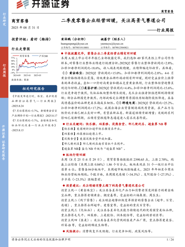 【开源证券】【20250831】二季度零售企业经营回暖,关注高景气赛道公司-24页