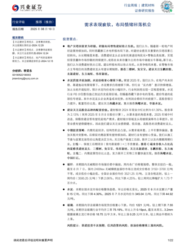 【兴业证券】【20250810】建筑材料行业周报:需求表现疲软,布局情绪回落机会-22页