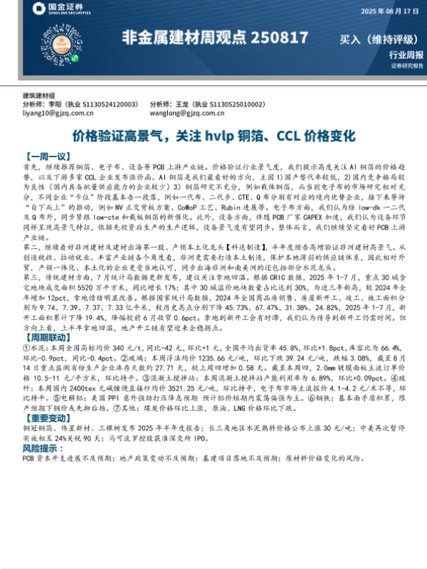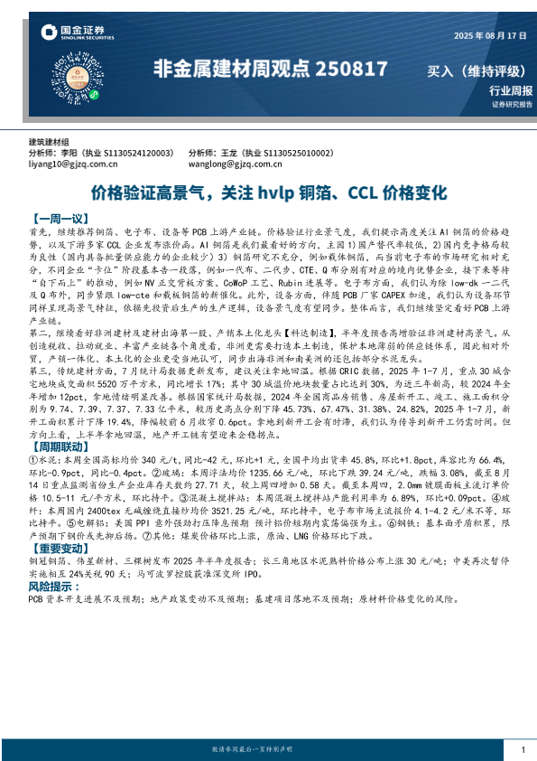 【国金证券】【20250817】非金属建材周观点:价格验证高景气,关注hvlp铜箔、CCL价格变化-19页