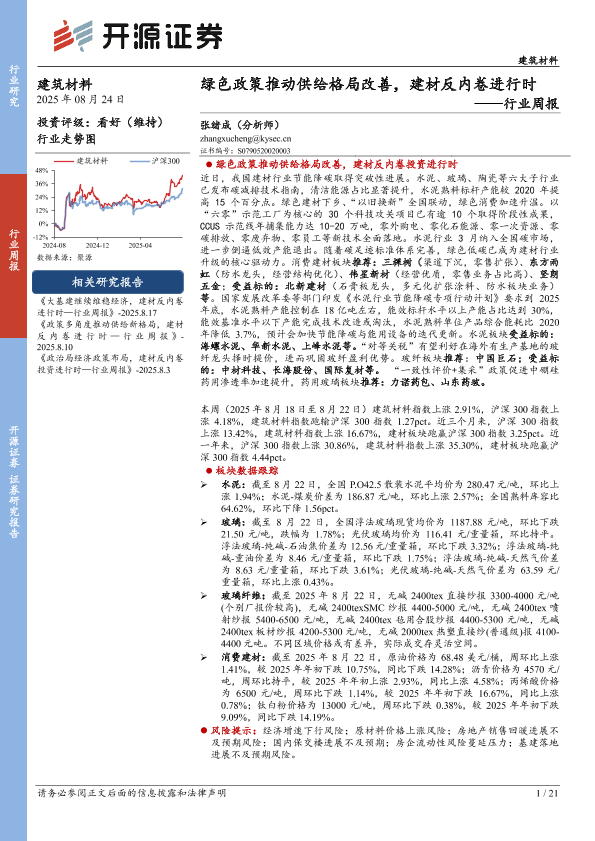 【开源证券】【20250824】建筑材料行业周报:绿色政策推动供给格局改善,建材反内卷进行时-21页