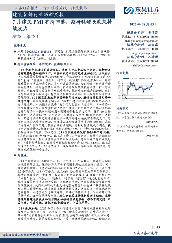 【东吴证券】【20250803】建筑装饰行业跟踪周报:7月建筑PMI有所回落,期待稳增长政策持续发力-13页