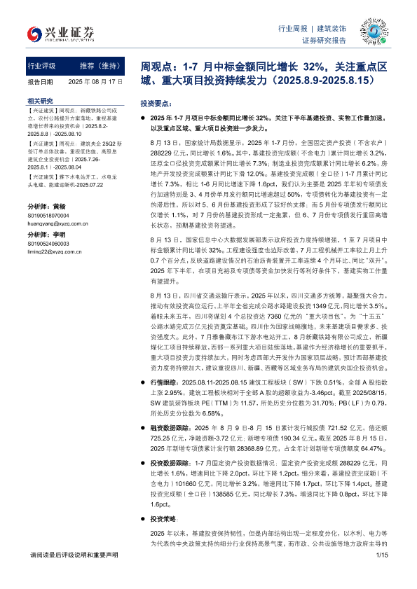 【兴业证券】【20250817】建筑装饰行业周观点:1-7月中标金额同比增长32%-关注重点区域、重大项目投资持续发力-15页
