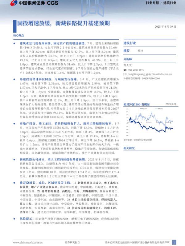 【银河证券】【20250819】建筑行业行业月报:固投增速放缓,新藏铁路提升基建预期-20页