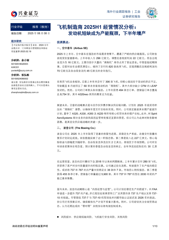 【兴业证券】【20250808】Airbus SE-波音公司-飞机制造商 2025H1经营情况分析:发动机短缺成为产能瓶颈,下半年增产-10页
