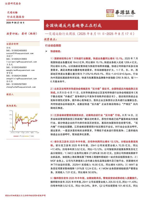 【华源证券】【20250818】全国快递反内卷趋势正在形成-交通运输行业周报-17页