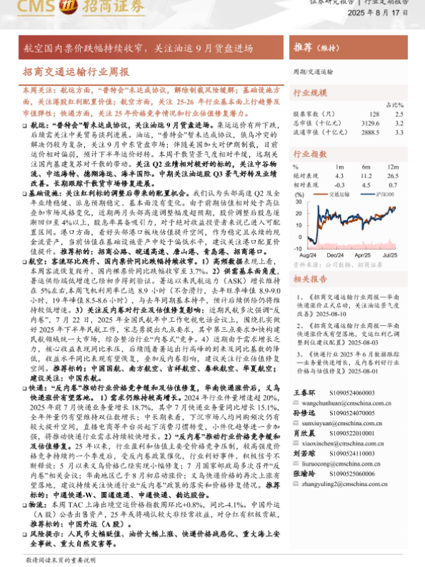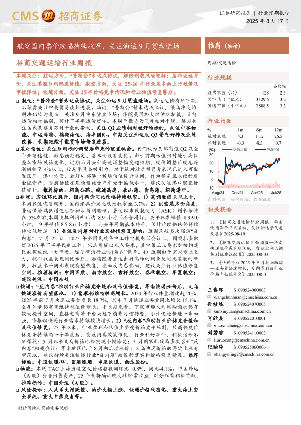 【海通证券】【20250817】航空国内票价跌幅持续收窄,关注油运9月货盘进场-16页