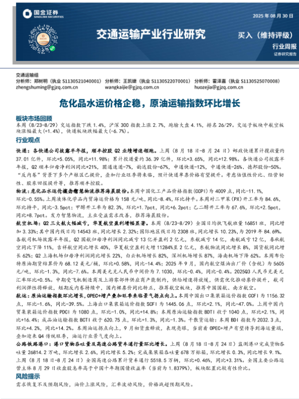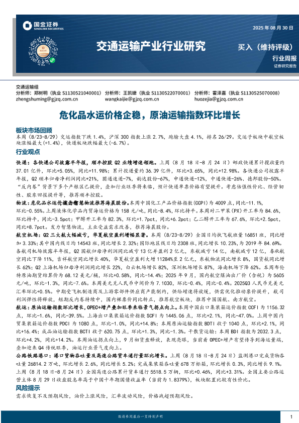 【国金证券】【20250830】危化品水运价格企稳,原油运输指数环比增长-17页