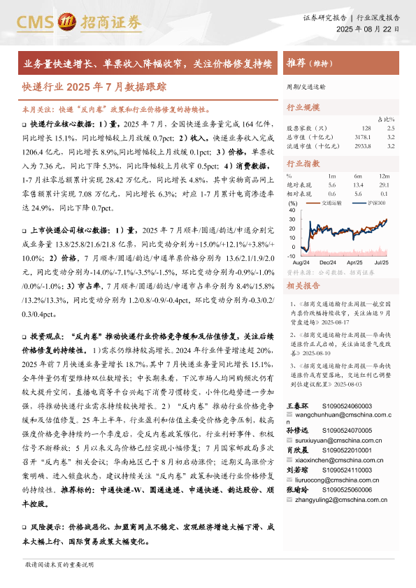 【海通证券】【20250822】快递行业2025年7月数据跟踪-业务量快速增长、单票收入降幅收窄,关注价格修复持续-13页