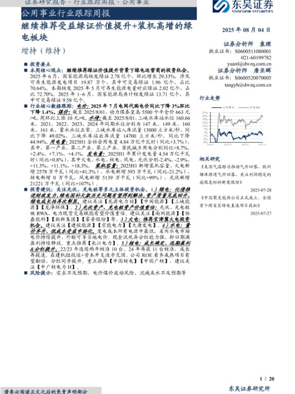 【东吴证券】【20250804】公用事业行业跟踪周报-继续推荐受益绿证价值提升+装机高增的绿电板块-20页
