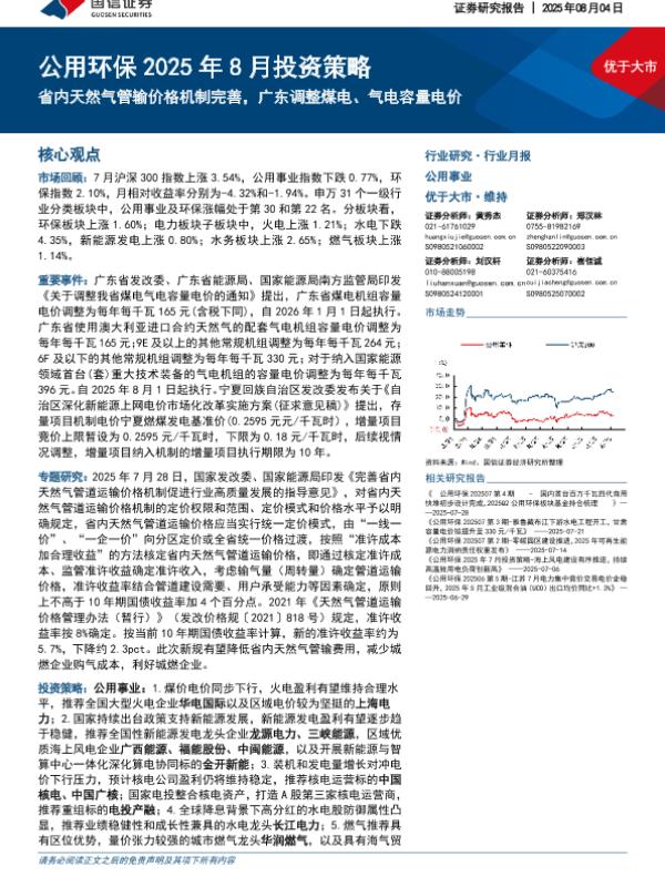 【国信证券】【20250804】公用环保2025年8月投资策略-省内天然气管输价格机制完善,广东调整煤电、气电容量电价-28页