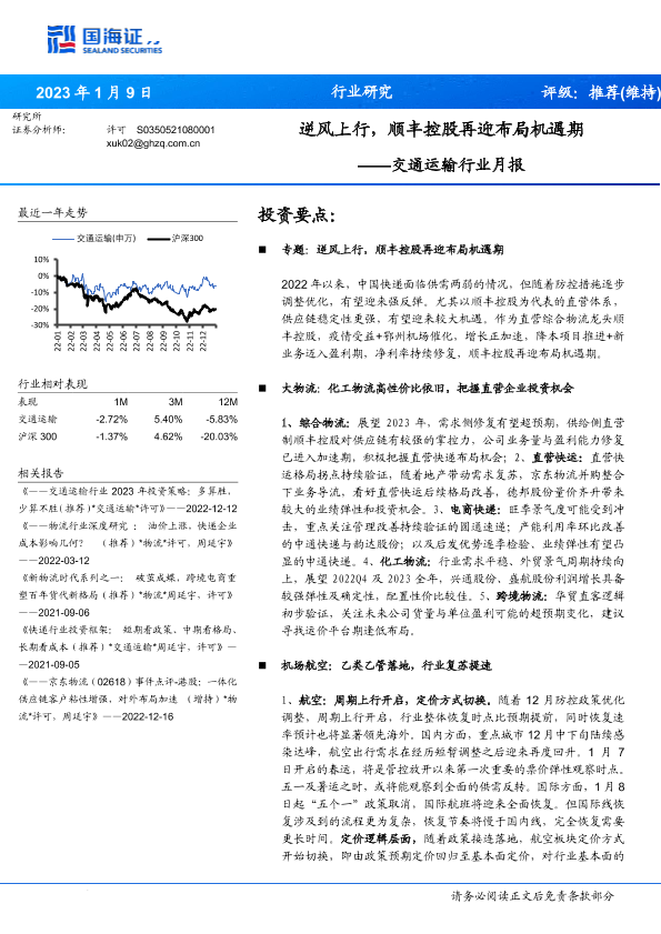 【国海证券】【20230109】交通运输行业月报:逆风上行,顺丰控股再迎布局机遇期-41页