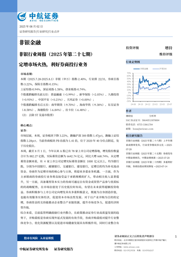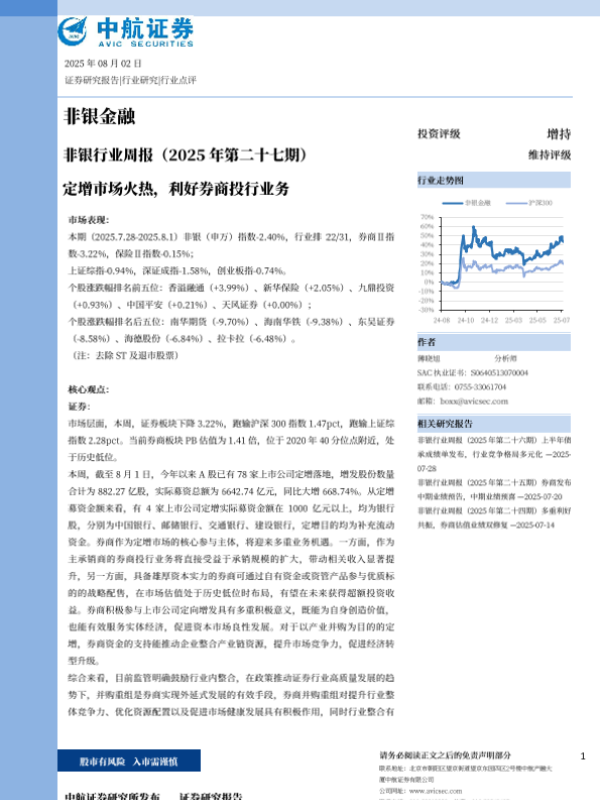 【中航证券研究所发布】【20250802】非银行业周报(2025年第二十七期):定增市场火热,利好券商投行业务-10页