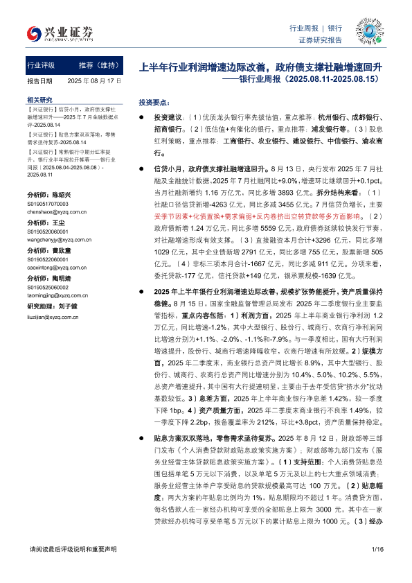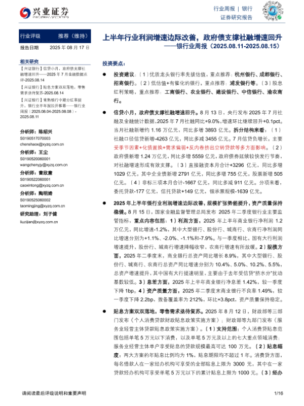 【兴业证券】【20250817】银行业周报:上半年行业利润增速边际改善,政府债支撑社融增速回升-16页