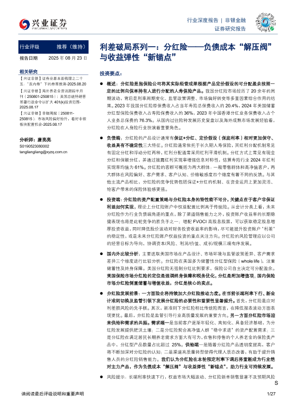 【兴业证券】【20250823】利差破局系列一:分红险——负债成本“解压阀”与收益弹性“新锚点”-27页