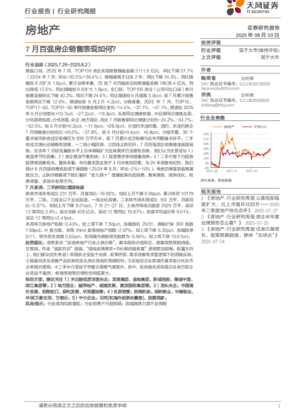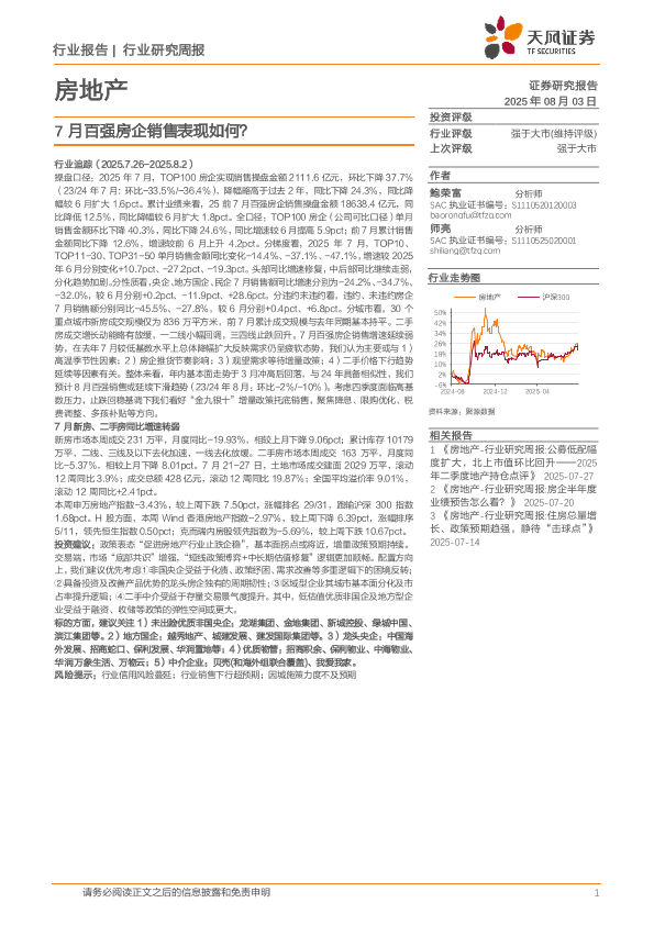 【天风证券】【20250803】房地产行业研究周报:7月百强房企销售表现如何?-15页