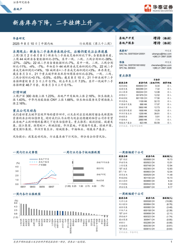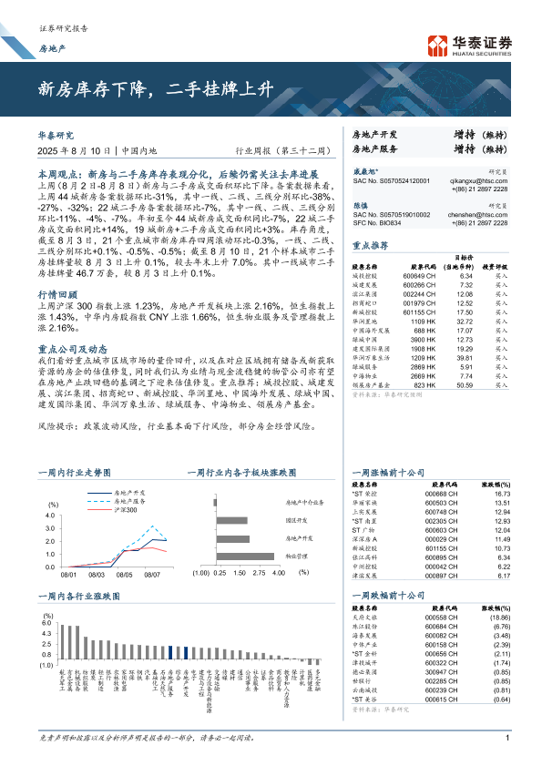 【华泰证券】【20250810】房地产行业周报(第三十二周)-新房库存下降,二手挂牌上升-11页