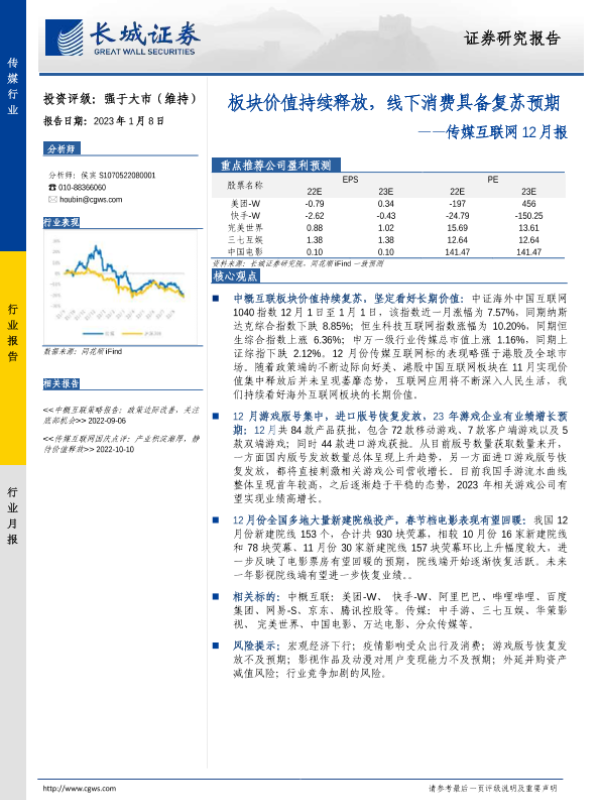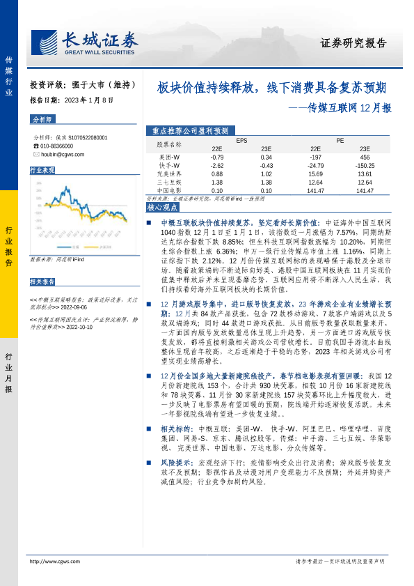 【长城证券】【20230108】传媒互联网12月报:板块价值持续释放,线下消费具备复苏预期-14页