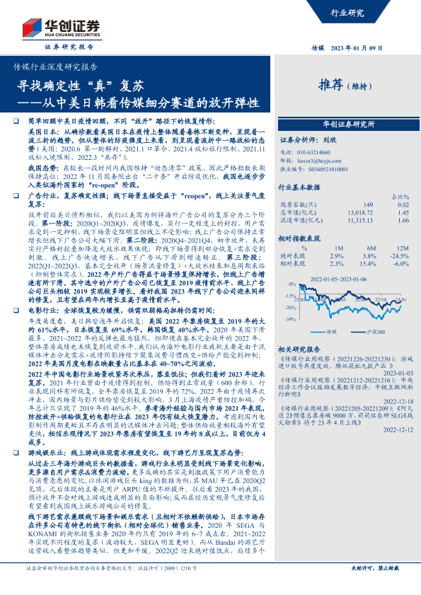 【华创证券】【20230109】传媒行业深度研究报告:从中美日韩看传媒细分赛道的放开弹性,寻找确定性“真”复苏-21页