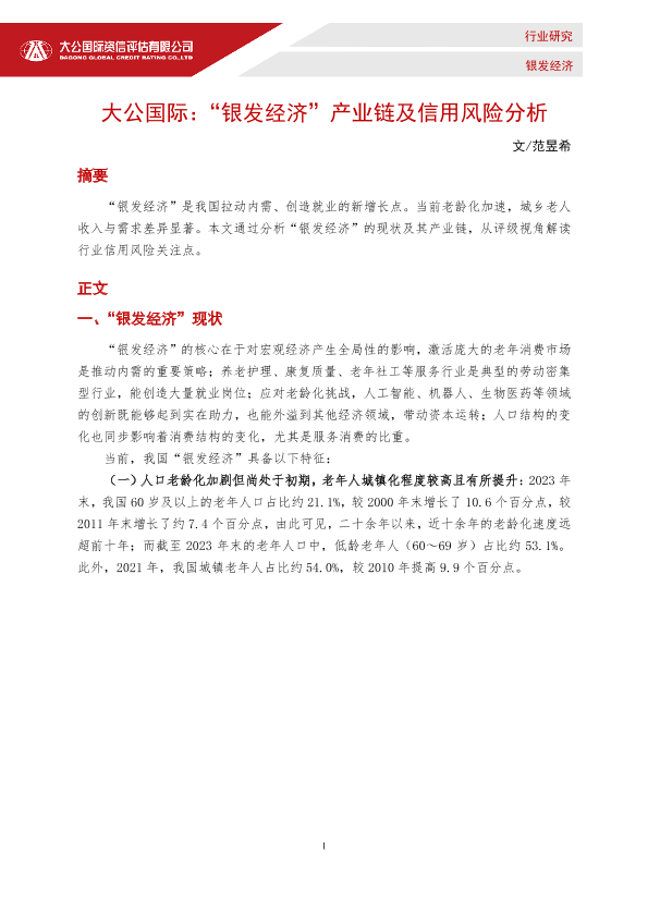 【大公国际】【2024】“银发经济”产业链及信用风险分析-6页