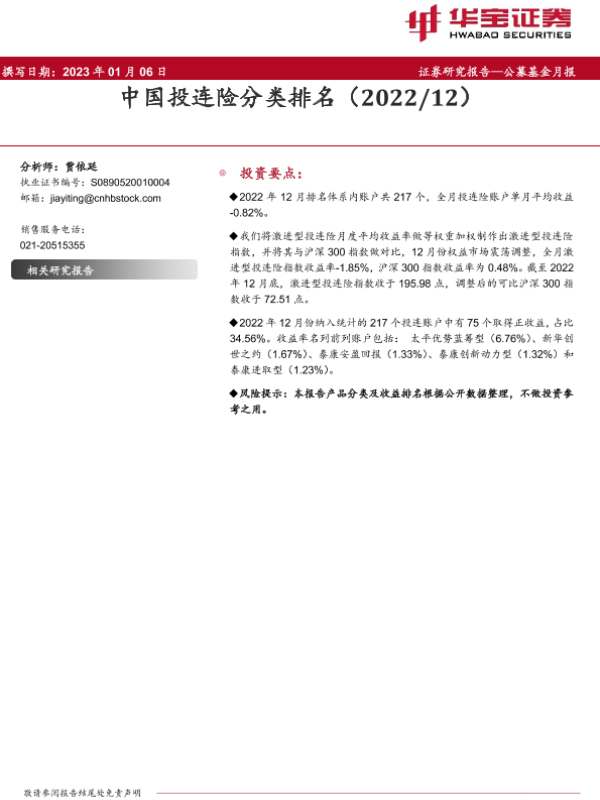 【华宝证券】【20230106】公募基金月报:中国投连险分类排名(2022/12)-19页