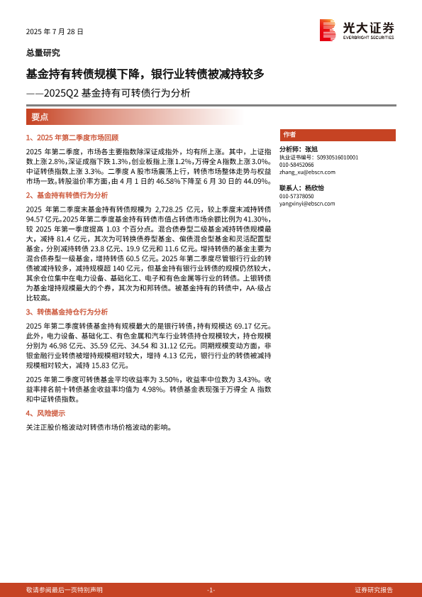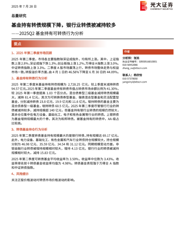 【光大证券】【202507】2025Q2基金持有可转债行为分析:基金持有转债规模下降,银行业转债被减持较多-11页