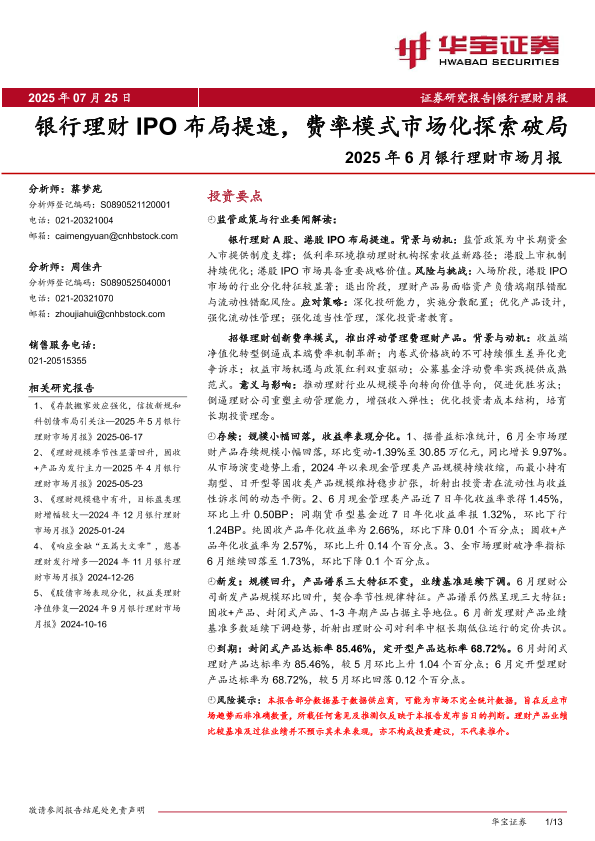 【华宝证券】【202507】2025年6月银行理财市场月报:银行理财IPO布局提速,费率模式市场化探索破局-13页