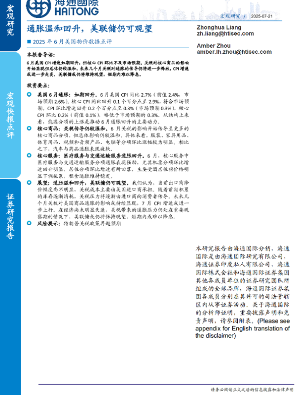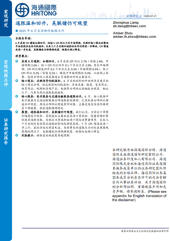 【海通国际】【202507】2025年6月美国物价数据点评:通胀温和回升,美联储仍可观望-13页