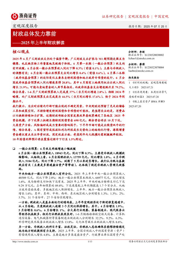 【浙商证券】【202507】财政总体发力靠前——2025年上半年财政解读-13页