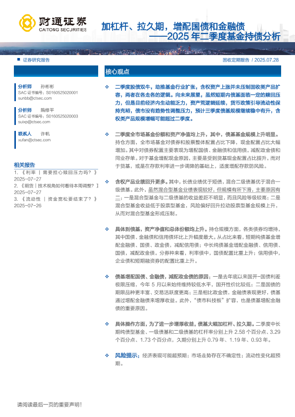 【财通证券】【202507】加杠杆、拉久期,增配国债和金融债 ——2025年二季度基金持债分析-21页