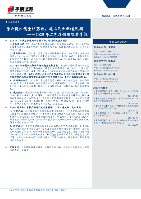 【华创证券】【202507】房企境内债重组落地,建工民企新增展期——2025年二季度信用观察季报-16页