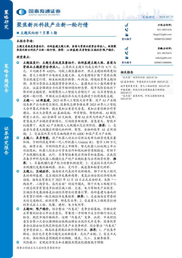 【国泰海通证券】【202507】主题风向标7月第3期:聚焦新兴科技产业新一轮行情-15页