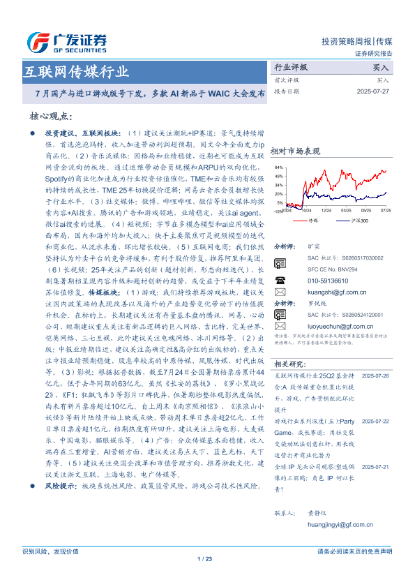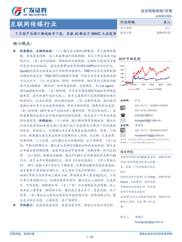 【广发证券】【202507】互联网传媒行业:7月国产与进口游戏版号下发,多款AI新品于WAIC大会发布-23页