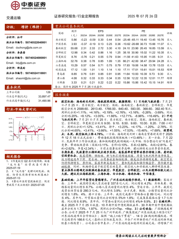 【中泰证券】【202507】交通运输行业:反内卷及海南封关或持续利好航空,关注申通快递高质量发展-24页