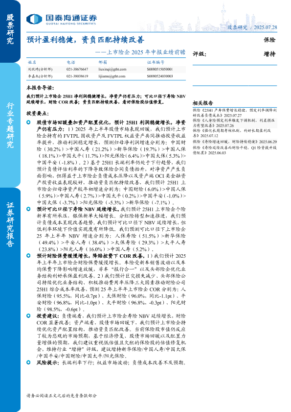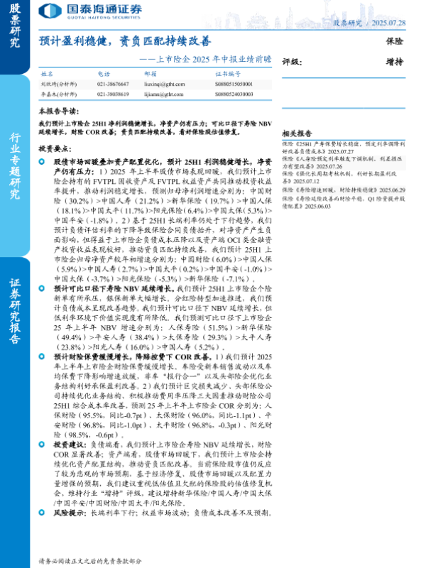 【国泰海通证券】【202507】保险行业2025年中报业绩前瞻:预计盈利稳健,资负匹配持续改善-10页