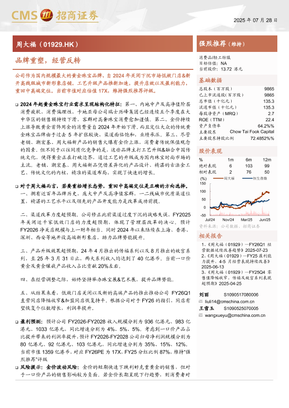 黄金珠宝 周大福 业绩反转 品牌重塑 行业分析